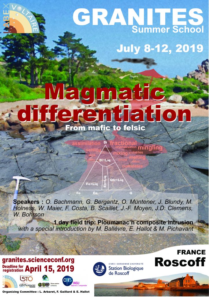 Grace à un partenariat ISTO - GéoScience Rennes, l'école se tiendra du 8 au 12 Juillet à Roscoff, Bretagne. Le Labex Voltaire est le sponsor principale de cette école qui regroupera d'éminents spécialistes du magmatisme. Veuillez consulter le siteweb par ce lien.